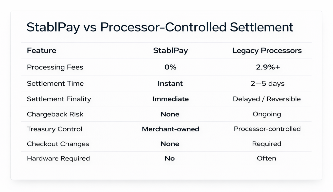 Funds settle instantly with cryptographic finality into the merchant-controlled treasury — eliminating multi-day delays, chargeback exposure, and processor-controlled cash timing.